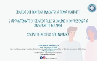 I giovedì di Pronto Crescere. 7 appuntamenti di giovedì sera alle 21, online o in presenza presso la nostra sede di Garbagnate Milanese in via Manzoni 46, dedicati ai genitori. [Leggi di più]