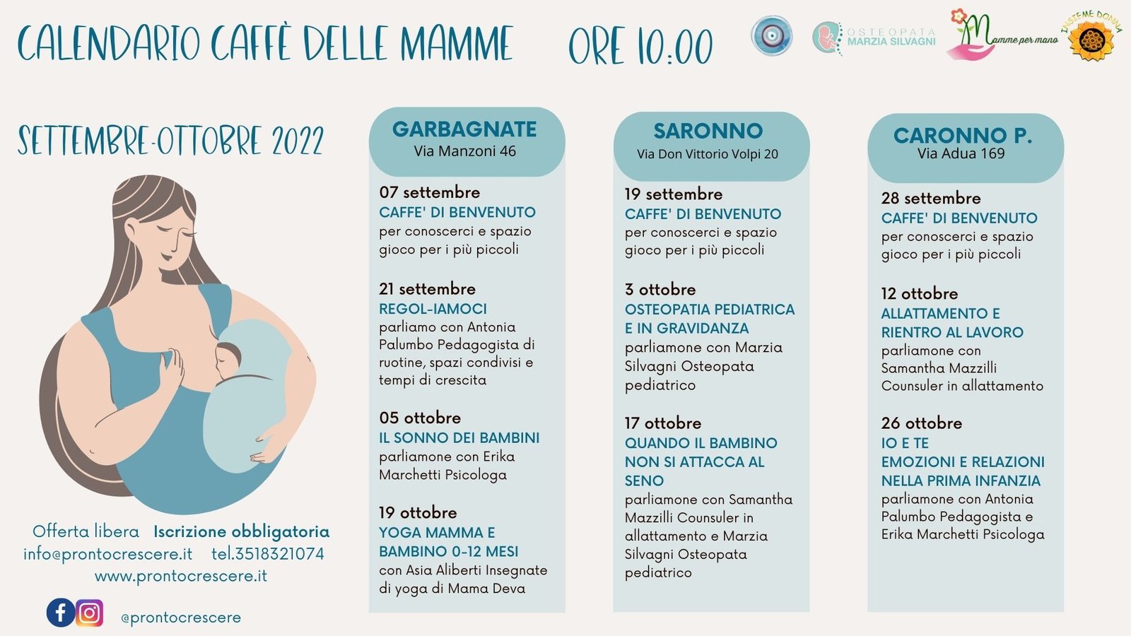 Un appuntamento ogni due settimane, tre sedi diverse una per ogni territorio, tematiche differenti per accogliere tutte le mamme interessate e i bambini!