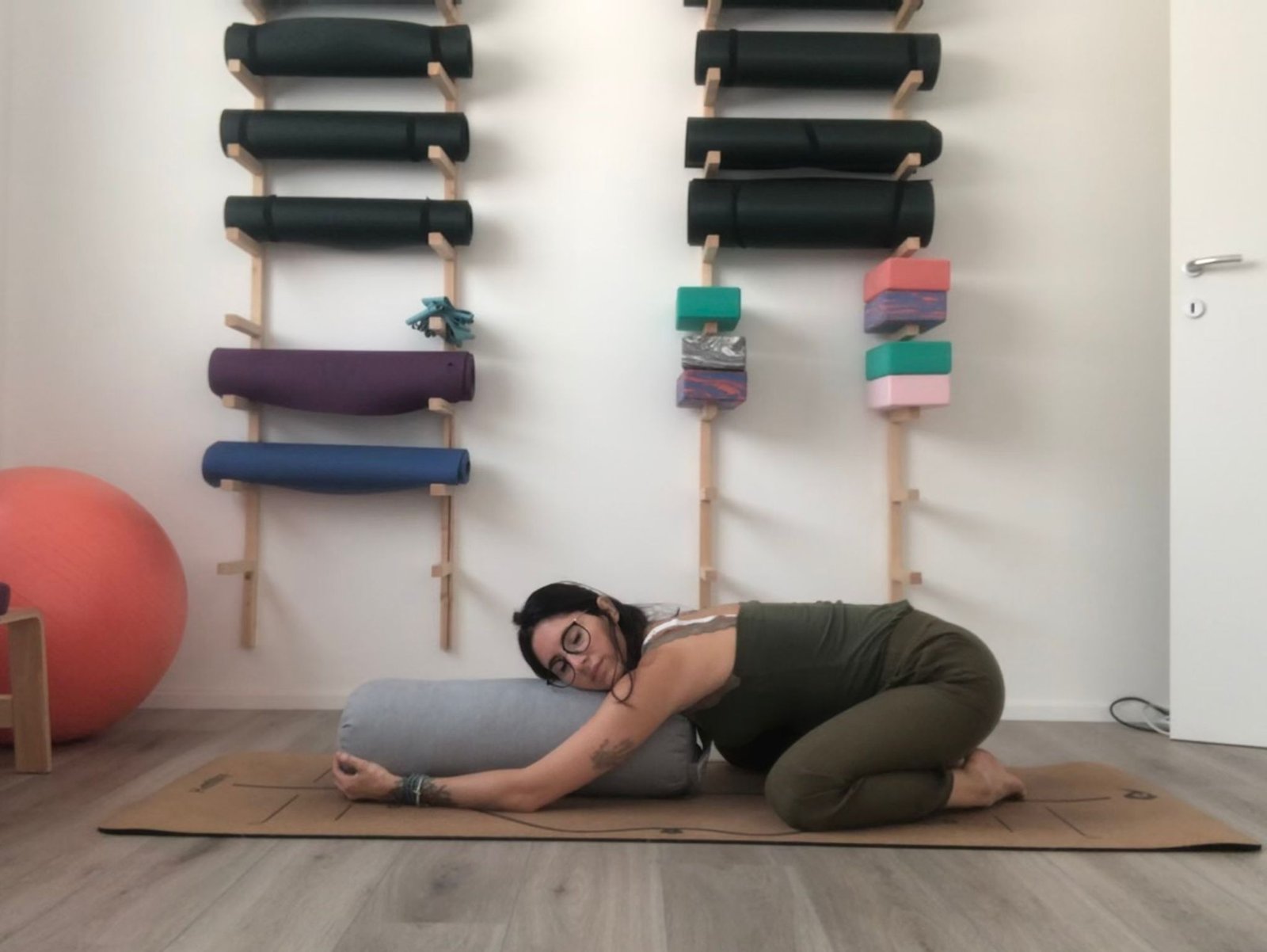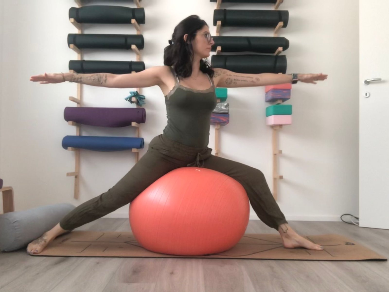 Posizione del guerriero 2 Rafforza le gambe e i muscoli della schiena, fondamentali per sostenere il peso del feto, aiuta anche ad aprire i fianchi e le spalle è fatta con il sostegno della fit ball siamo certe di mantenere la postura corretta senza affaticarci troppo.